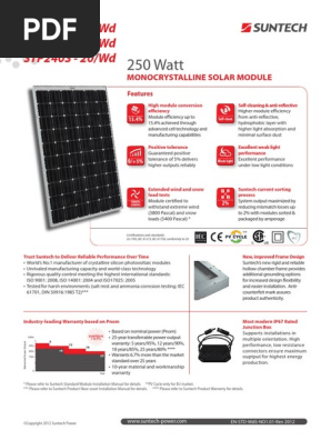 Sw 250 mono version 2 0 and 2 5 frame performance under standard test conditions stc maximum power p max open circuit voltage v oc maximum power point voltage v mpp short circuit current i sc maximum power point current i mpp sw 250 250 wp 37 8 v 31 1 v 8 28 a 8 05 a performance at 800 w m noct am 1 5 maximum power p max open circuit.
